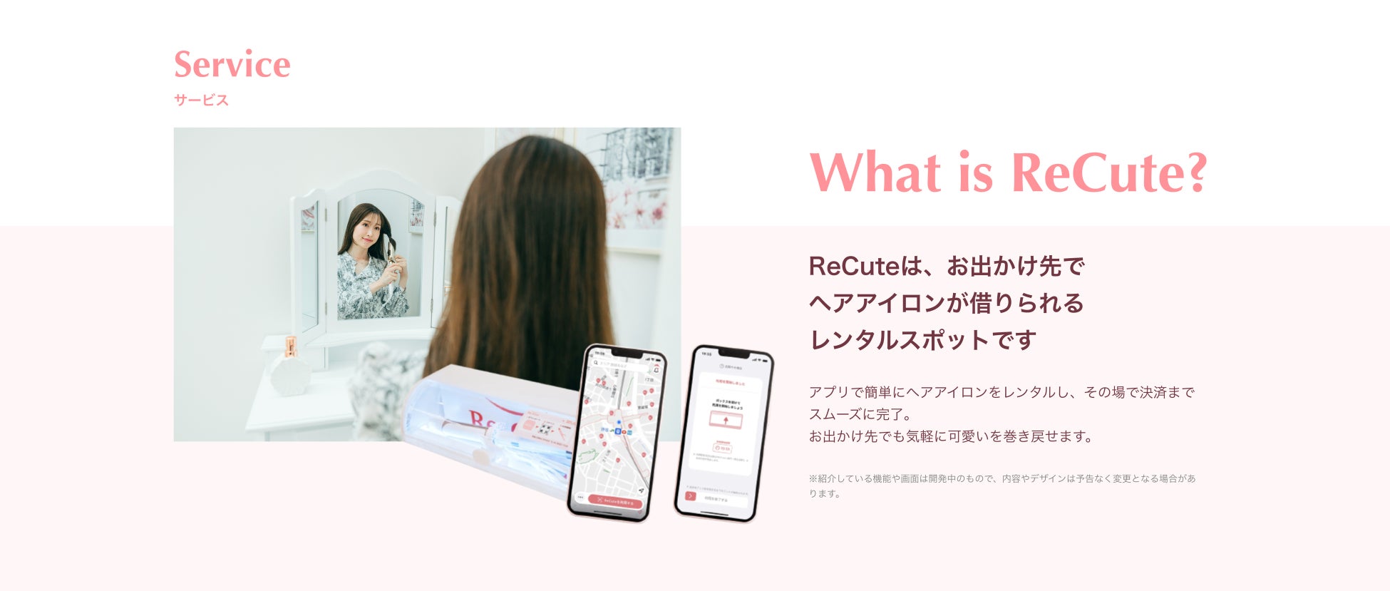 ヘアアイロンのレンタルスポット「ReCute」を展開。エリア展開は都内から進め、最終的に全国約3,500か所まで貸出スポットを増やしてまいります。今後はヘアアイロンのレンタルスポットだけでなく、化粧品やヘアケア商材のテスターの提供など、サービスを拡充していくことで、いつでもどこでも綺麗な自分に戻れる「美のインフラ化」をめざします。