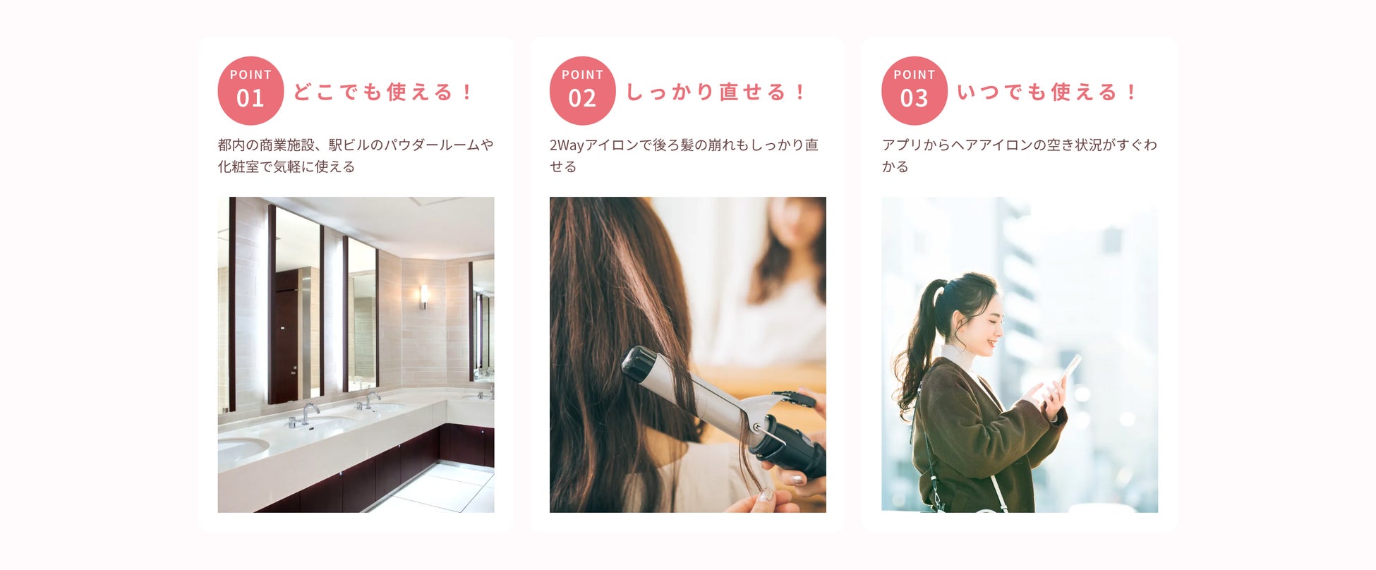 パウダースペースに設置された専用ボックスから、スマートフォンアプリを通じて、手軽にヘアアイロンをレンタルし、外出先でも髪の毛を巻き直すことができます。