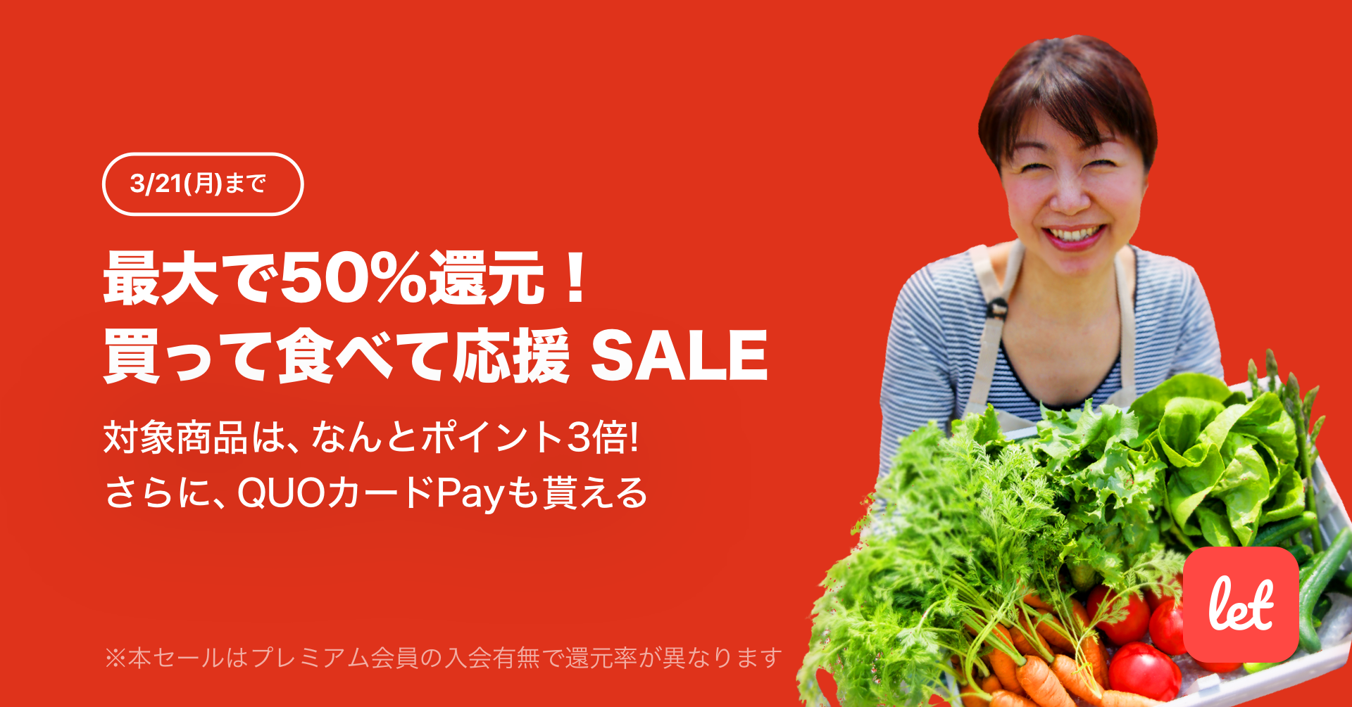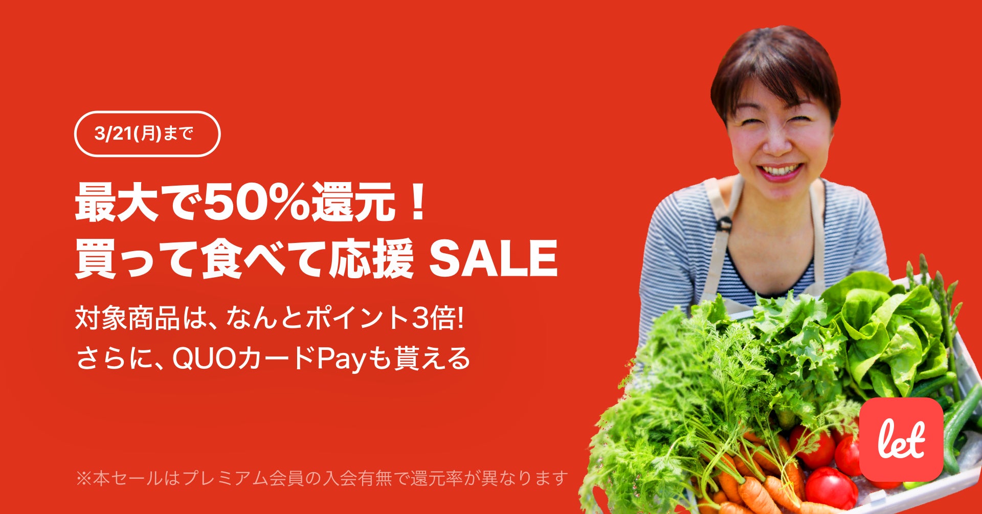 株式会社レット(本社:東京都港区、代表:佐藤 航陽)が運営する、食品ロス/在庫ロス削減のマーケット「Let(レット)」内で「最大で50%還元!買って食べて応援 SALE」を3月18日(金) 18:00より開催します。期間中、プレミアム会員様限定で対象商品を購入いただいた場合、QUOカードPayをもれなくプレゼント。最大実質半額で購入可能となります。