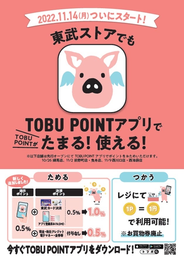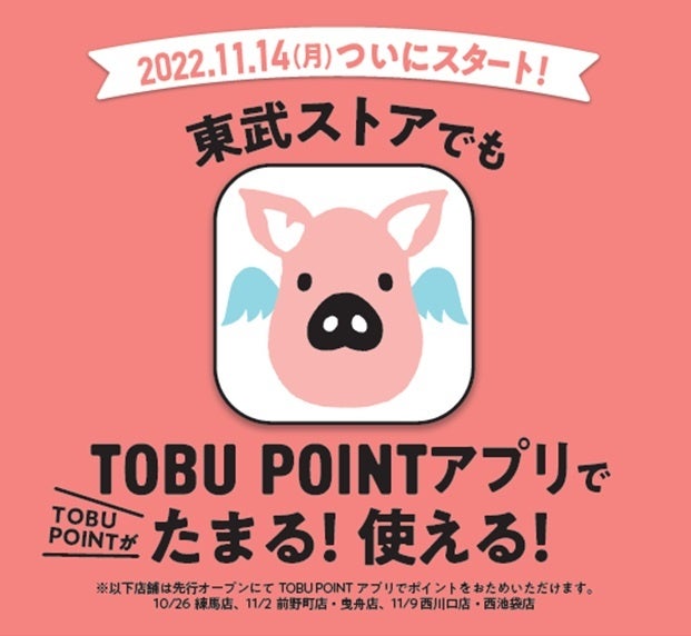 東武ストアでも TOBU POINTアプリで TOBU POINTがたまる!使える! 2022年11月14日(月)スタート!