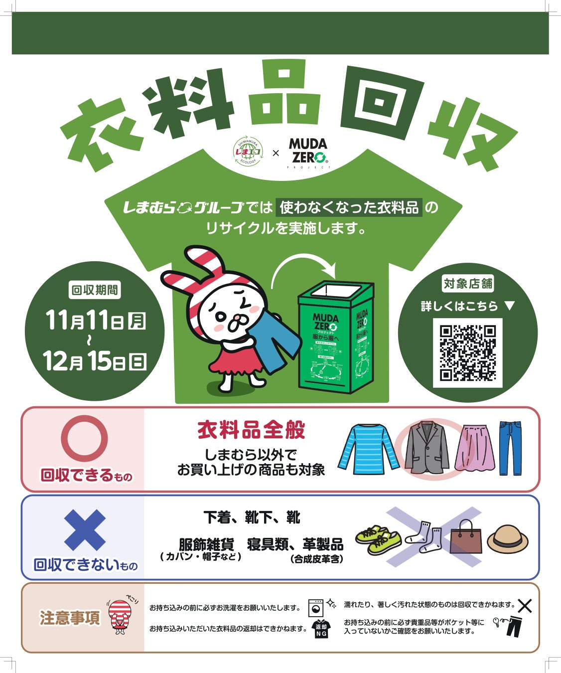 株式会社しまむら(本社所在地:埼玉県さいたま市大宮区北袋町1-602-1、代表取締役:鈴木 誠)は、11月11日(月)から12月15日(日)まで、衣料品回収をしまむらグループ200店舗で実施します。 店舗で回収した衣料品は、株式会社カイタックファミリーの「MUDAZERO」プロジェクトを通じて服から服へのリサイクルを行います。