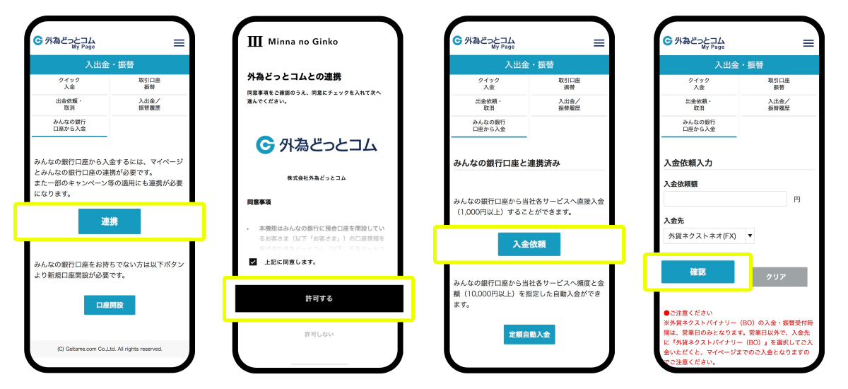 近日中にFXをはじめとする各種投資サービスと連携した、口座直結型の即時入金および定額自動入金サービスの提供を予定しています。従来の入金方法と比較して口座登録が格段にスムーズになり、シームレスな入金と各種投資サービス利用をサポートします。お客さまの入金にかかる手数料は無料です。これにより、FX業界のパイオニアであり、最適な資産運用環境を提供する外為どっとコムのFXをはじめとする各種投資サービスがより便利にご利用いただけるようになる予定です。