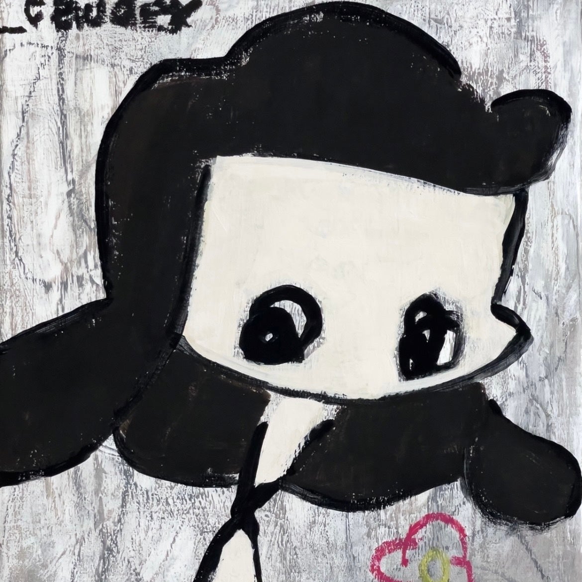 10年間のバンド活動を経て、独学で絵を描き始めました。バンド活動の間、肌身離さず持っていた人形をモチーフにしています。身近にある印刷物のデザインやアイコンの上から直接ドローイングをして、それを元にキャンバスの絵を描いています。