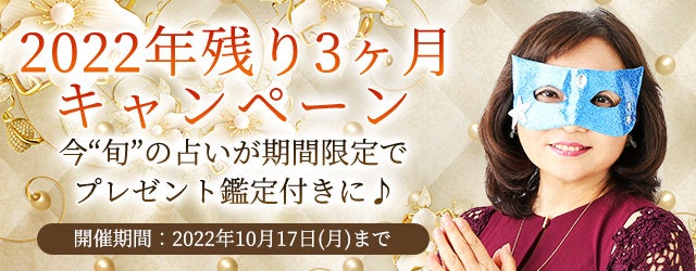 『2022年残り3ヶ月キャンペーン』では、一年の終わりが見えてくる今の時期に合わせて、2022年の残り3ヶ月を占う特別な鑑定をご用意。キャンペーン期間限定で、プレゼント鑑定付きにてご提供致します!この機会にぜひ「水晶玉子◆エレメンタル占星術」で今“旬”の占いをお楽しみ下さい。