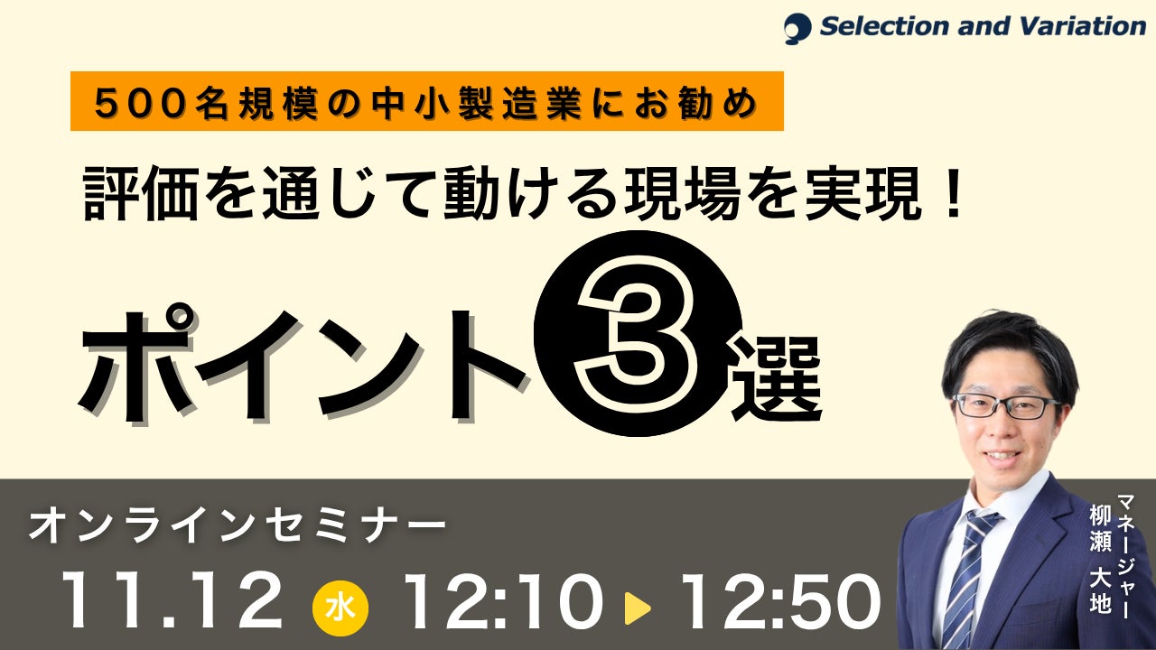 組織・人事コンサルティングファームであるセレクションアンドバリエーション株式会社(以下、当社、東京都千代田区丸の内、大阪市西区、名古屋市西区 / 代表取締役社長:平康慶浩/ URL:https://sele-vari.co.jp/ )は『500名規模の中小製造業にお勧め 評価を通じて動ける現場を実現!ポイント3選』セミナーを2025年11月12日(水)12:10〜12:50に開催することをお知らせいたします。