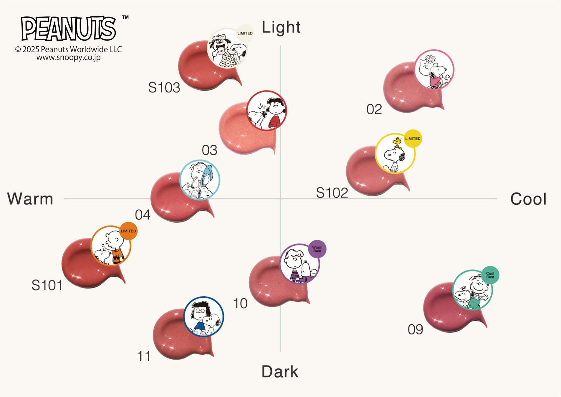 リップ本体もカラーごとに、スヌーピーと仲良しの仲間たちの楽しげなイラストが描かれています。