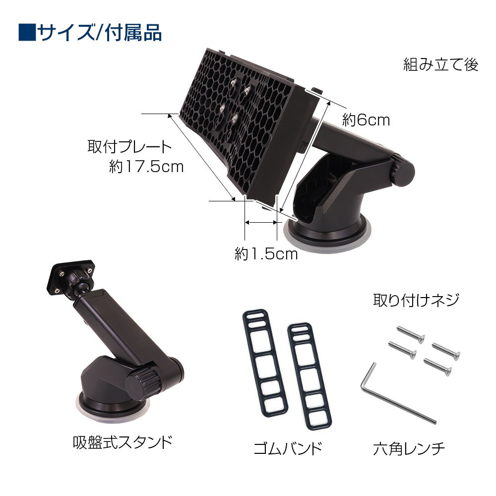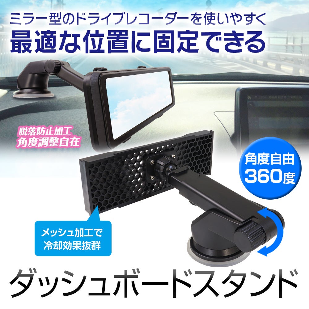 ミラー型ドライブレコーダーやデジタルルームミラー(ゴムバンド取付タイプ)をダッシュボードに設置できるスタンド。純正ルームミラーがそのまま利用でき、視界の妨げにはなりません。