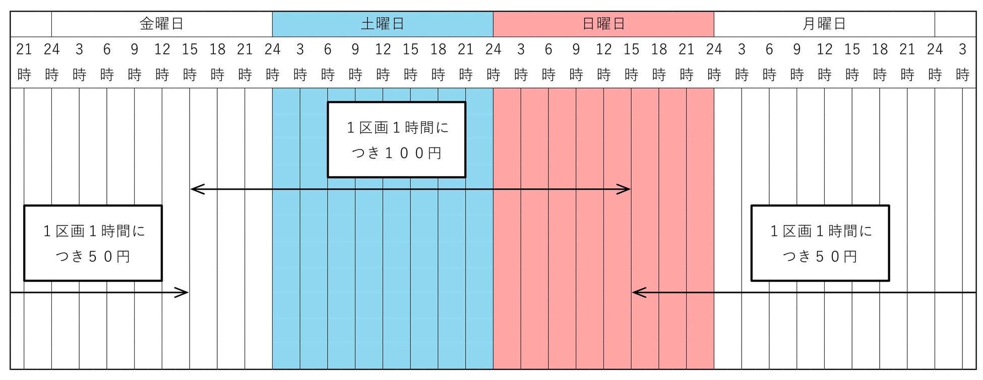 土、日、祝日: 前日15時から当日15時まで 1区画1時間につき 100円