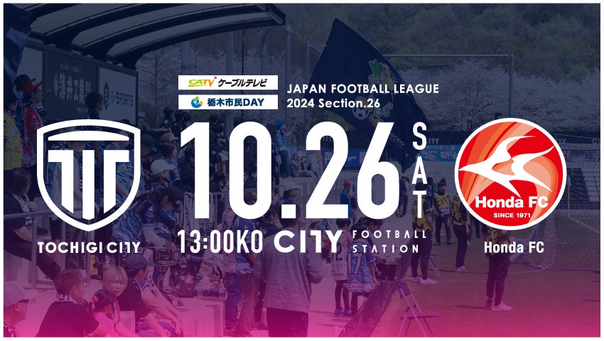 2024年10月26日(土)に開催する、第26回日本フットボールリーグ 26節 Honda FC戦(13:00キックオフ@CITY FOOTBALL STATION)は、「ケーブルテレビ株式会社」様にマッチデースポンサーとしてご協賛いただくことが決定いたしました。また今節はホームタウンである「栃木市民デー」として開催いたします。
