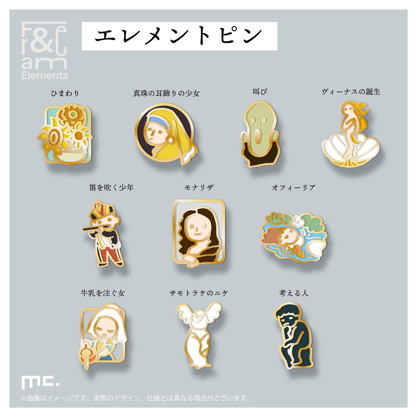 お気に入りの要素=エレメントをモチーフ化したピンバッジです。お気に入りの絵、力をもらえる絵、何だか気になってしまう絵…それはすべて自分を形作るエレメンツ。額に飾ればあなただけの美術館に!
