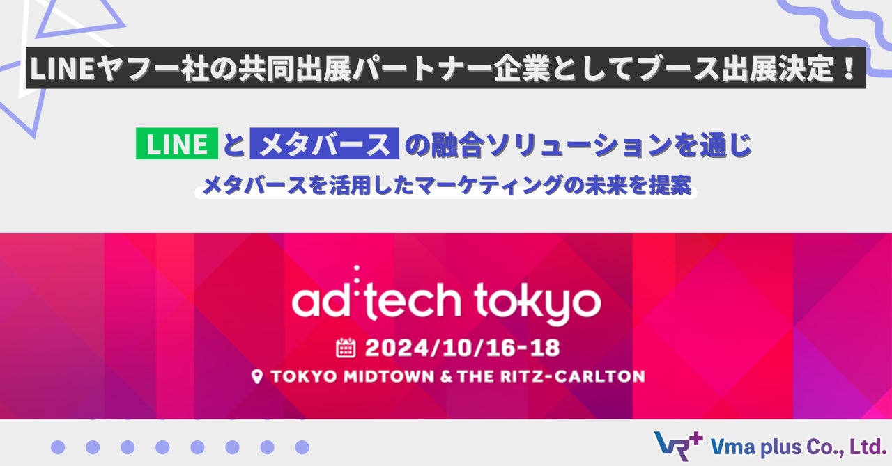 メタバースWeb3のコンテンツ企画・ディレクションを行うVma plus(ブイマプラス)株式会社(本社:東京都品川区、代表:津田徹、以下「Vma plus」)は、2024年10月16日(水)~18日(金)に行われるマーケティングの国際カンファレンス「ad:tech tokyo (アドテック東京)」に、LINEヤフー社の共同出展パートナー企業としてブース出展することが決定いたしました。
