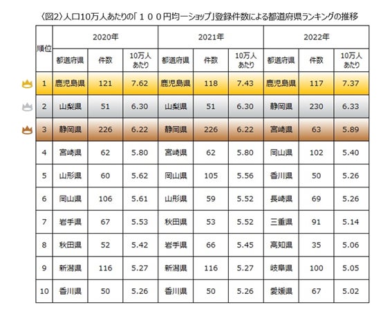 2020年の人口10万人あたりの100円均一ショップ登録件数トップは鹿児島県・静岡県・宮崎県でした。