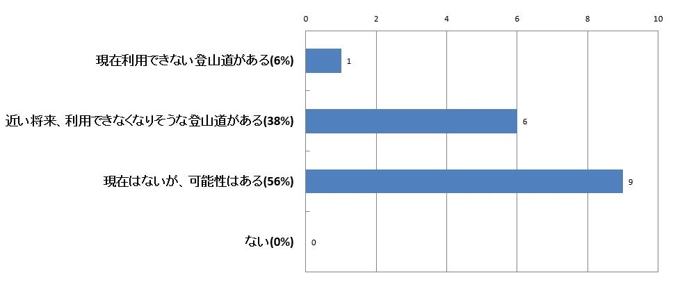 「現在はないが、将来的に可能性はある」と回答した団体が56%と最多、「近い将来利用できなくなりそうな登山道がある」が38%、「現在利用できない登山道がある」が6%となりました。