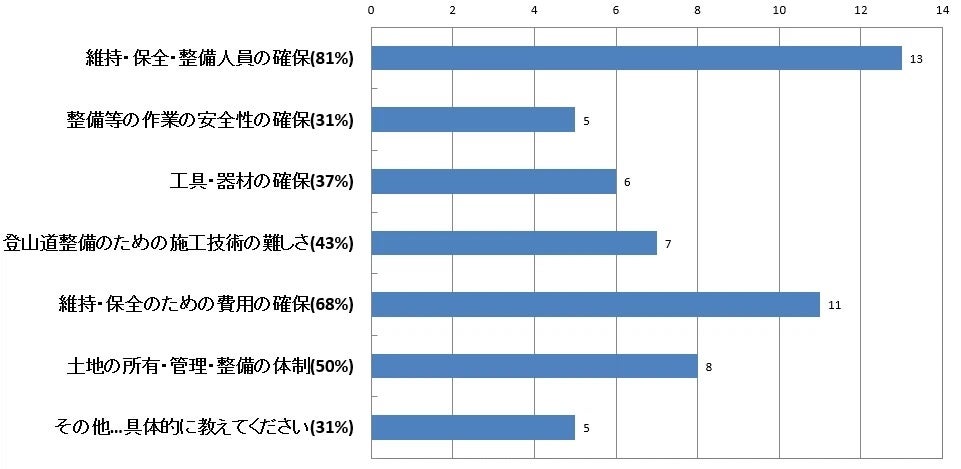 登山道の維持・保全について現在「課題がある」と答えたのは16団体で、回答したすべての団体が課題を抱えている、という結果となりました。
