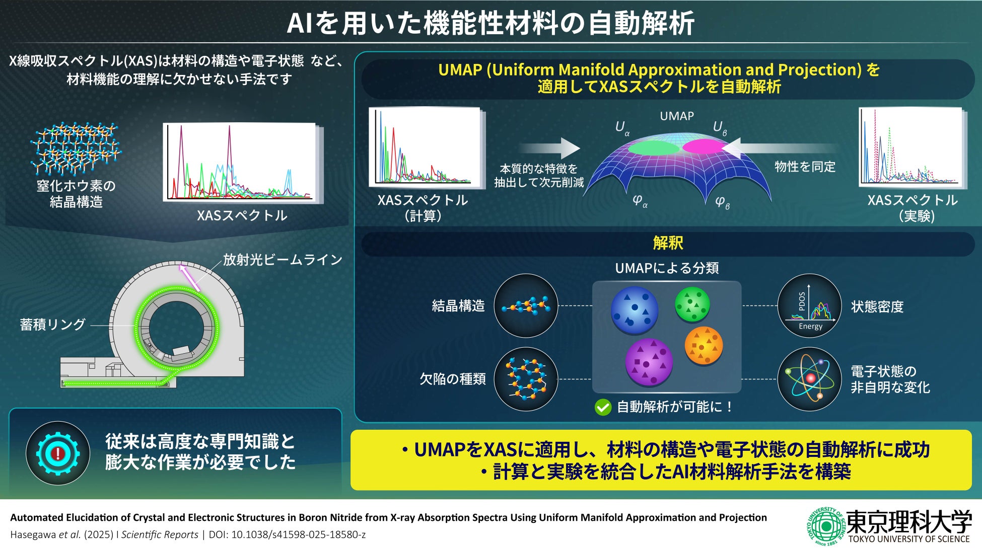 東京理科大学大学院 先進工学研究科 マテリアル創成工学専攻 修士2年の長谷川 礼佳氏、同Varadwaj Arpitaポスドク研究員、山崎 貴大助教、小嗣 真人教授、東京大学 物性研究所の新部 正人特任研究員、堀尾 眞史助教、松田 巌教授、東京科学大学 総合研究院の安藤 康伸准教授、筑波大学 数理物質系の近藤 剛弘教授、の共同研究グループは、教師なし機械学習(*1)の一つであるUMAP(*2)を用いた解析モデルを開発し、複雑なX線吸収スペクトル(*3)から、材料の結晶構造や電子状態を自動で精密に解析することに成功しました。