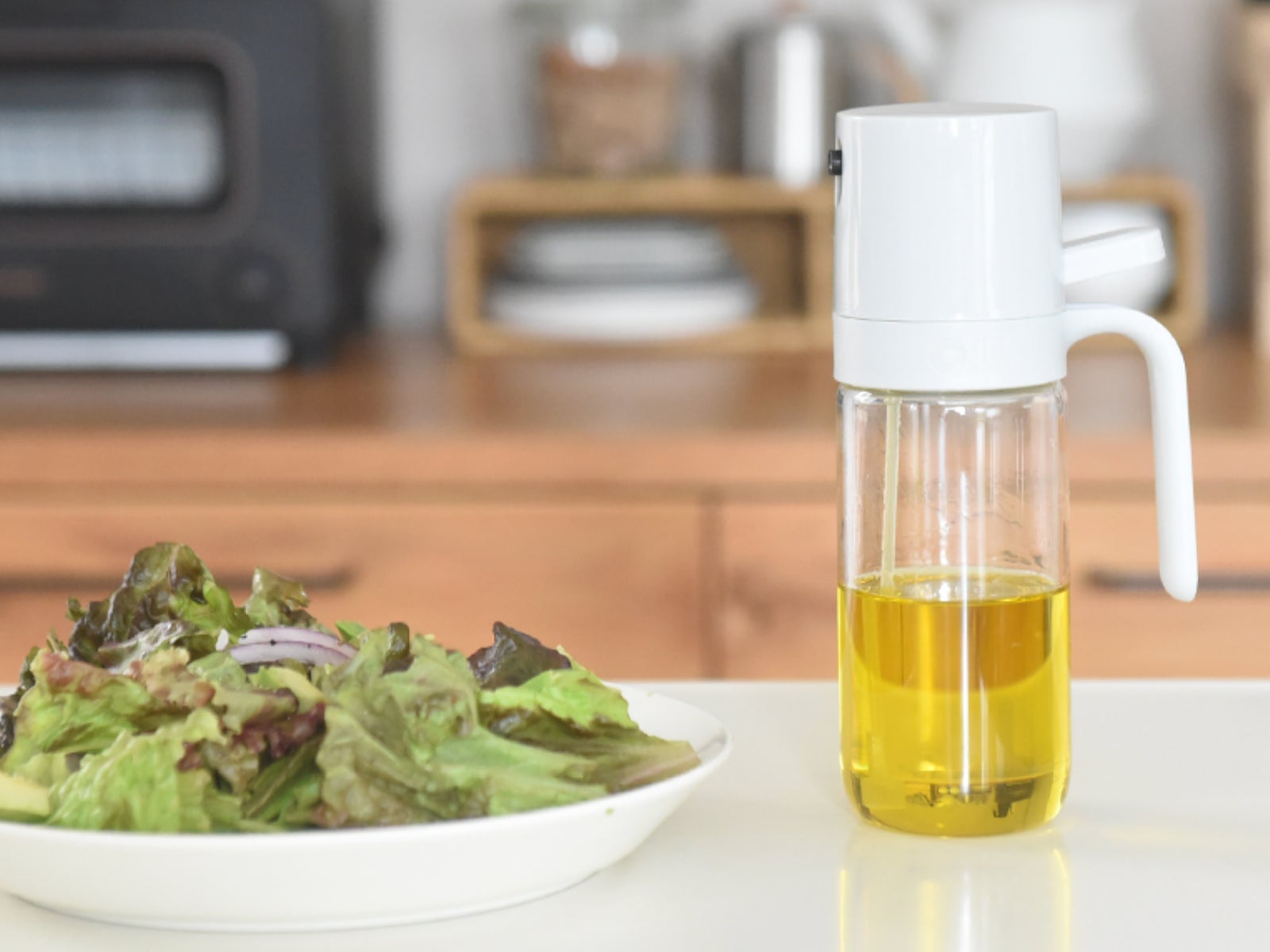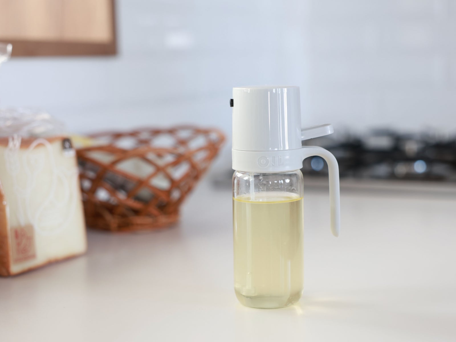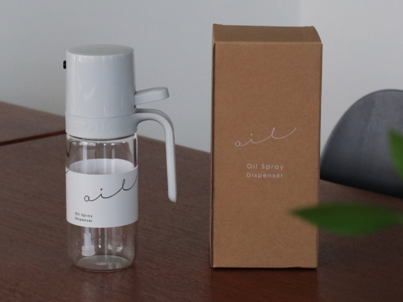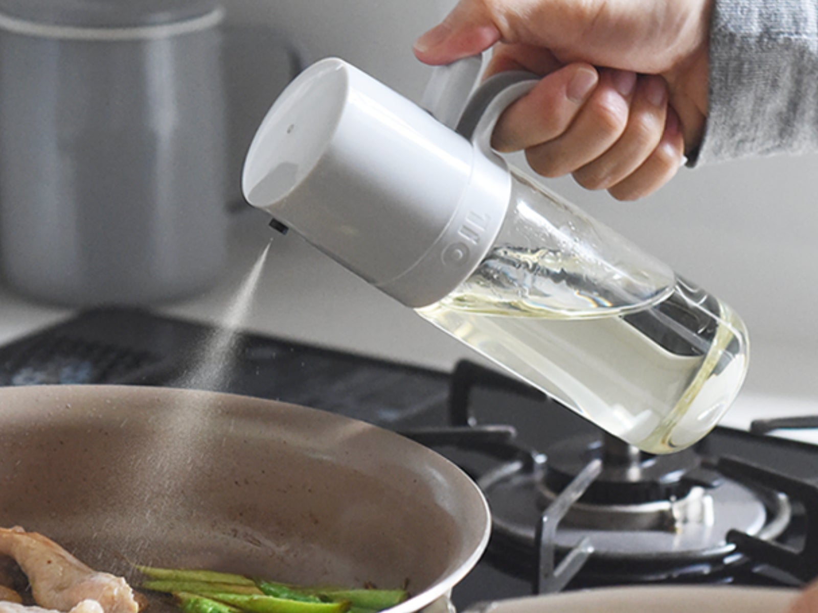 片手でサッと使えて、ミスト状のオイルが広がる「オイルスプレーボトル」。最小限の油で調理できるから、いつもの食事がもっとヘルシーに。アンジェ別注モデルの「ライトグレー」は10月15日発売です。