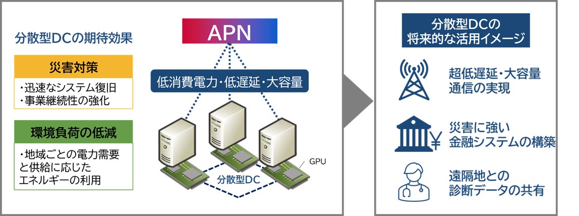 APNによる分散型DCの実用化は、複数の拠点でデータを効率的に処理・保存できるため、災害時における迅速なデータ復旧や環境負荷の軽減に貢献するだけでなく、通信・金融・医療など、リアルタイムかつ大容量の処理が求められる分野においても安定したサービス提供を可能にすると期待されています。
