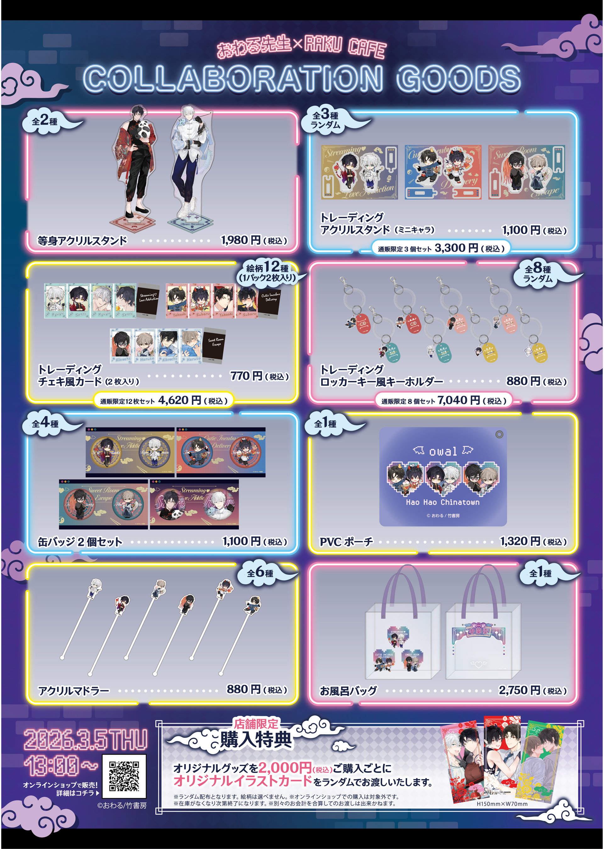 おわる先生の人気作品から3作品、「ストリーミング♡ラブアディクション」「淫魔くんデリバリー」「スウィートルームエスケイプ」のキャラクターたちが登場する『ネオンチャイナ』をテーマにしたコラボカフェを期間限定で開催が決定!