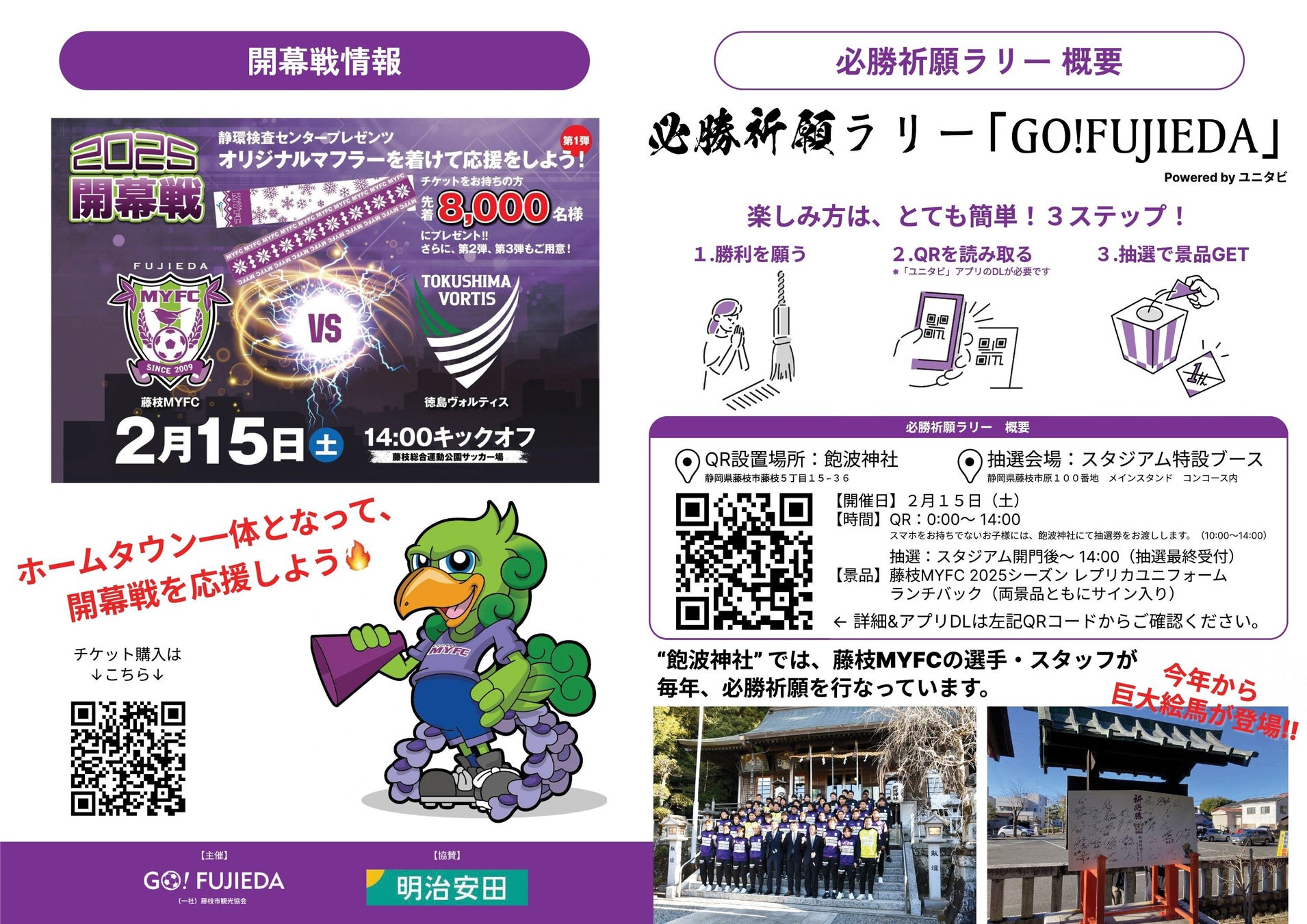 Jリーグ観戦客の周遊を促進するため、藤枝MYFCの開幕戦に必勝祈願してから試合観戦するデジタルスタンプラリーの必勝祈願ラリー「GO!FUJIEDA」を開催します。