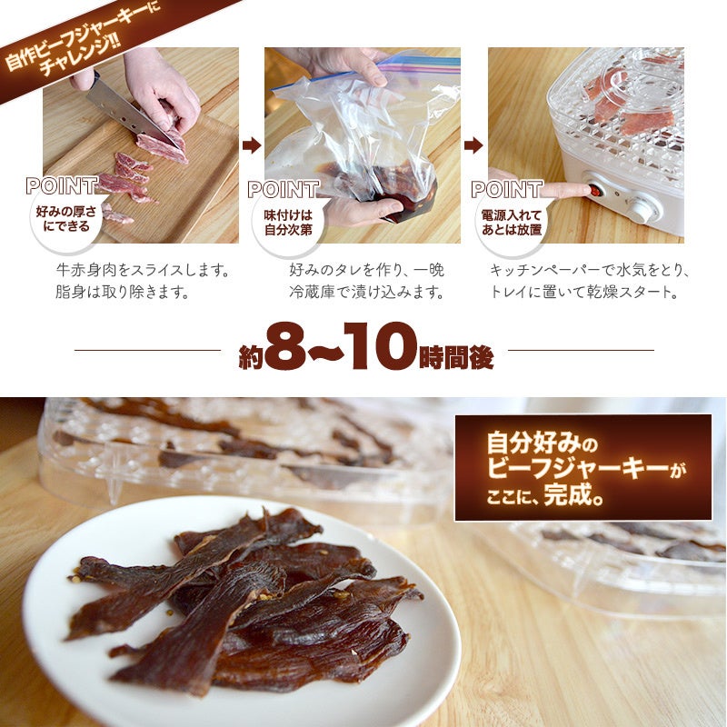 本製品は自宅で自分で手軽に自家製ビーフジャーキーやドライフルーツが作れる食品乾燥機です。