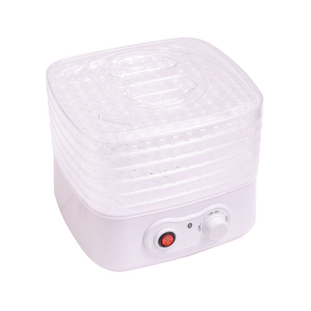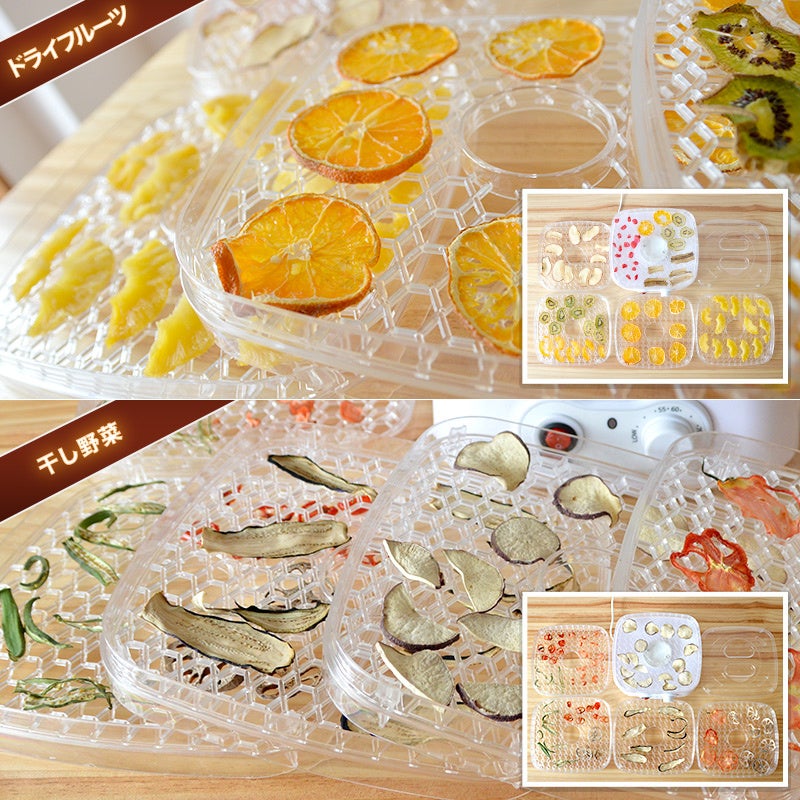 材料をトレイにのせ、電源を入れれば約8時間でビーフジャーキーやドライフルーツ、干し野菜が作れます。トレイは5枚付属、中に入れるものの厚みにより、それぞれ高さを変えて重ねて使用することが可能です。