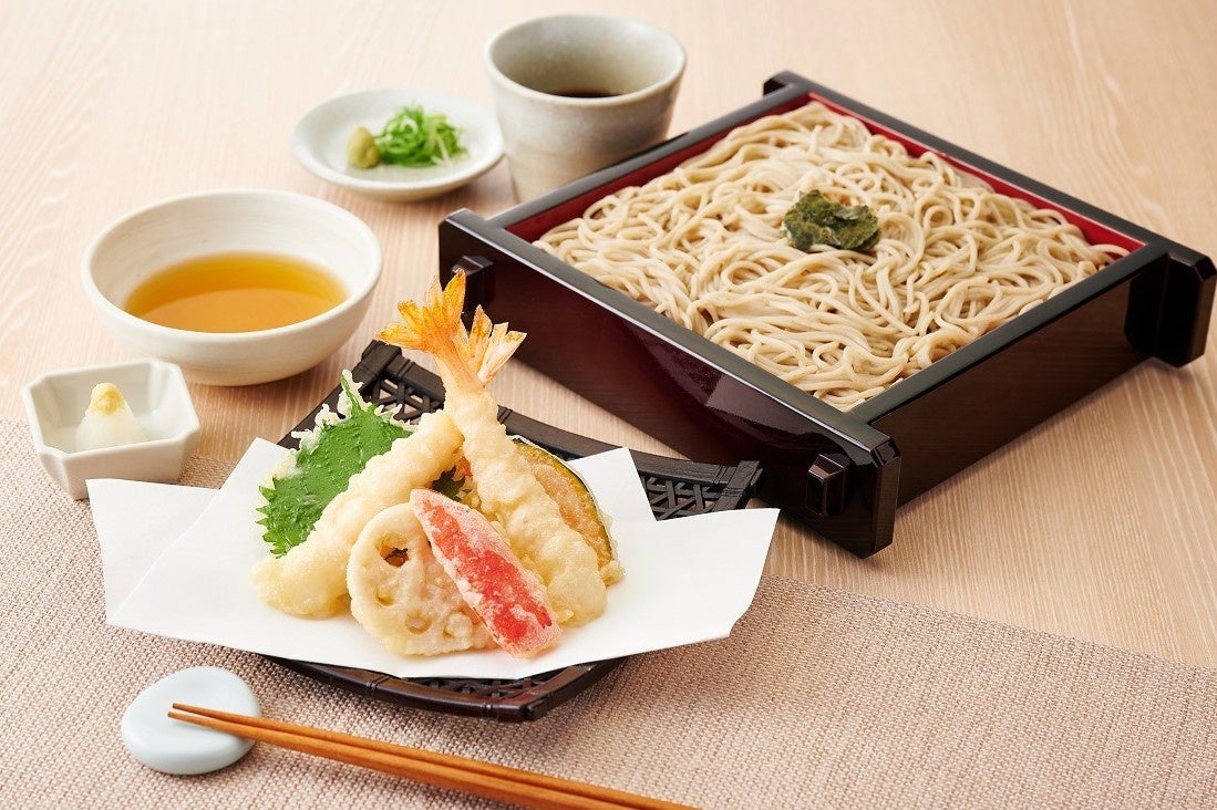 家族亭自慢の揚げたての天ぷらととこだわりのおそばを楽しめる「海老の天ざる」。