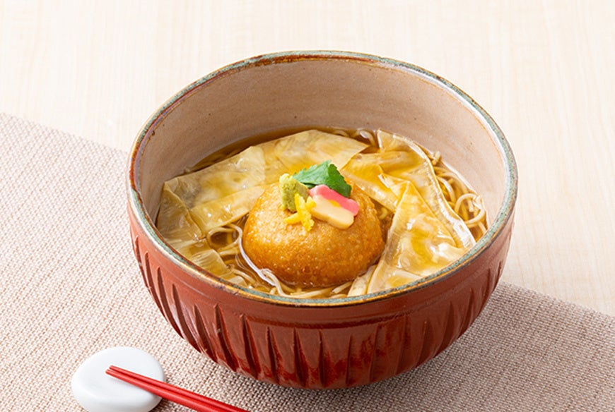 香ばしく揚げたての蓮根まんじゅうと湯葉をつかったあんかけだしで味わう麺、見た目も華やかな一品。わさびをアクセントにお召し上がりください。