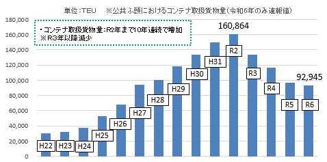 令和3年以降は、コロナ禍による世界的なサプライチェーンの混乱や中東情勢等の影響を受け、他港への貨物の集約化が進んだことから減少が続いていますが、官民で構成される「川崎港戦略港湾推進協議会」において、コンテナ取扱貨物量の官民目標を「令和11年度までに年間取扱貨物量20万TEU達成」と設定し官民一体となって国内外の荷主や船社に対して積極的な誘致活動を行っております。