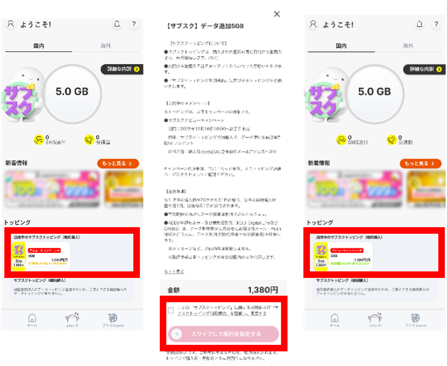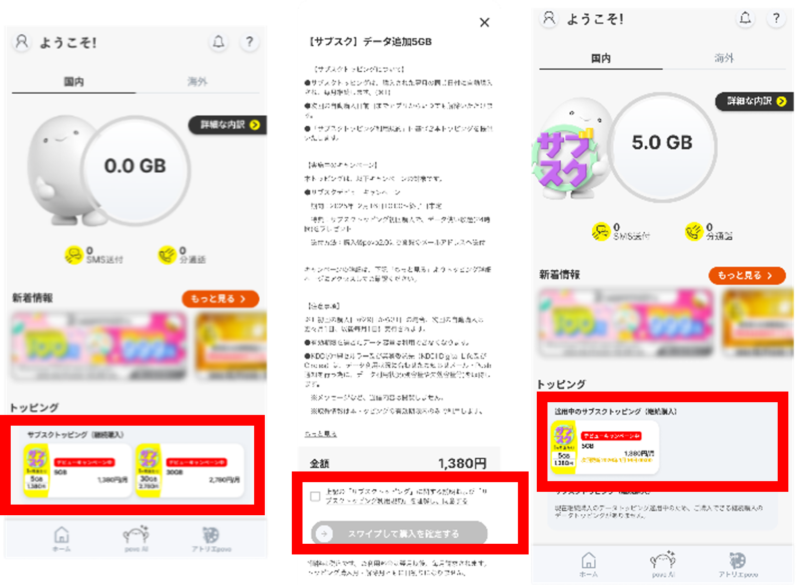 「サブスクトッピング」を購入いただくと、翌月以降は毎月同じ日(注3)に自動でトッピングが購入され、データがチャージされます。なお、自動購入の前日および自動購入後にpovo2.0に登録されたメールアドレスにお知らせします。データ容量の有効期限は、購入から1カ月です。