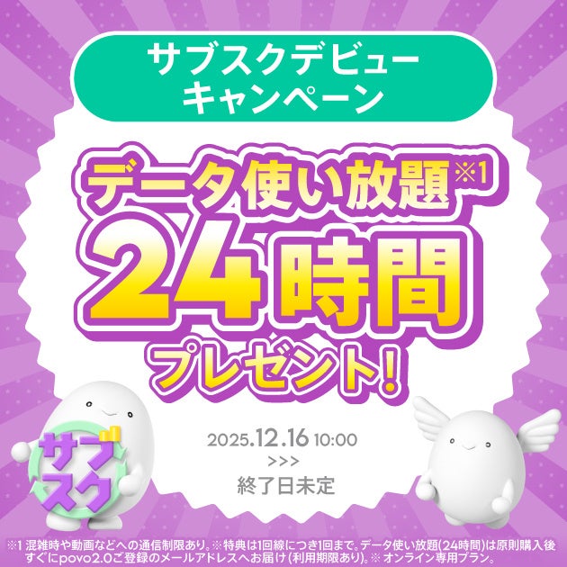 また、「サブスクトッピング」の提供開始を記念し、購入者全員に「データ使い放題(24時間)」(注1)(注2)のプロモコードをプレゼントする「サブスクデビューキャンペーン」を実施します。