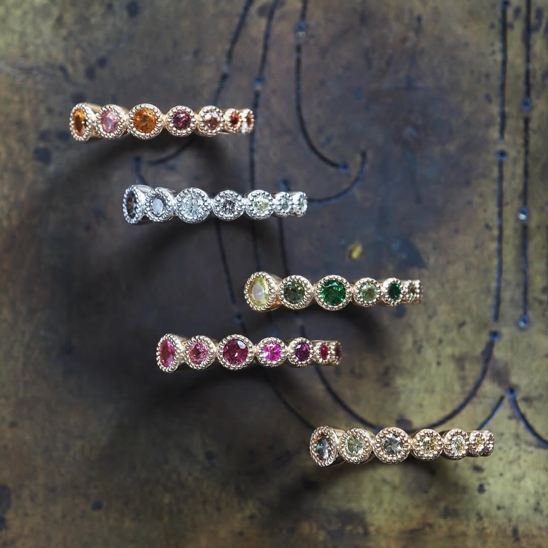 石の配置を精緻に計算し、幅をわずかに絞ることで、重ねづけがいっそうしやすいバランスに。指に触れる柔らかな縁はそのままに、光がリズムを描くように流れるシルエットが特徴です。