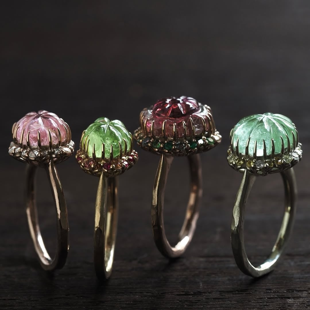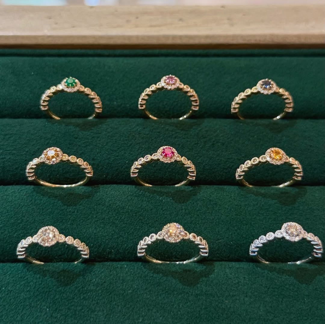 可憐な花を思わせるフォルムに、センターストーンをメレダイヤが取り囲む、PARCELLE JEWELRYを象徴するシリーズです。サイズや色の多彩な組み合わせがあり、それぞれが指先に独自のきらめきを添えます。カーヴィングに合わせた限定モデルなど、POP UP SHOPでしかご覧いただけないものも。