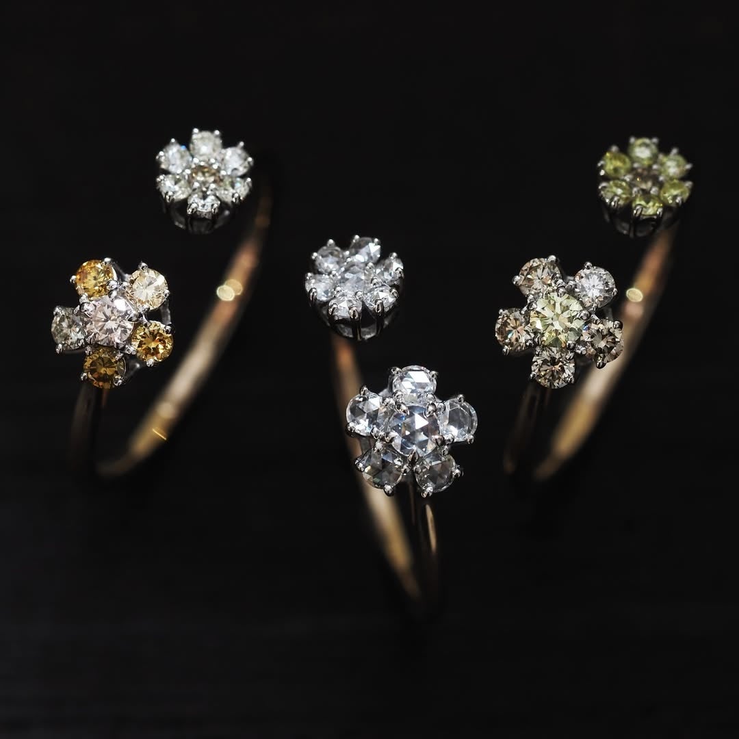 中央には瑞々しい輝きを湛えたローズカットやブリリアントカットのダイヤモンドを据え、その周囲を極小のメレダイヤで石座の縁ぎりぎりまで敷き詰め、花のようなシルエットを描きました。