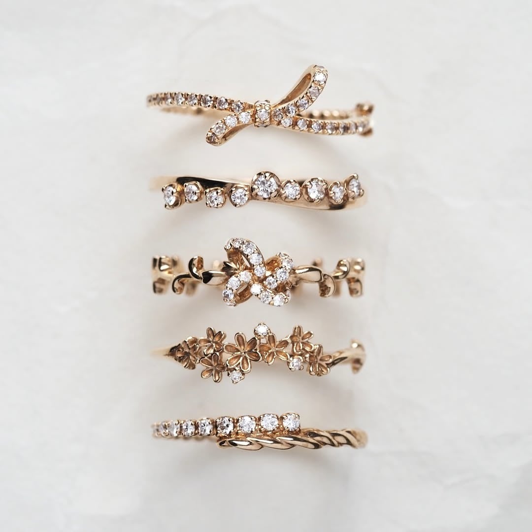 自然の草花やリボンのしなやかなフォルムを繊細な細工で表現したシリーズ。細身ながら強度と美しさを備え、重ねづけでも日常に自然な彩りを添えます。