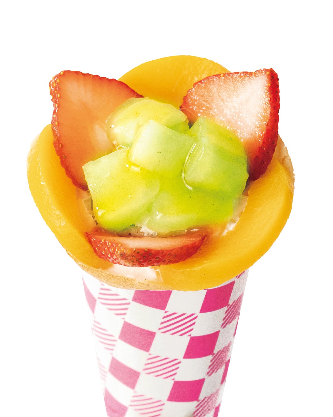 黄桃やメロン、苺をたっぷり盛り込み、甘いピーチソースとふんわりホイップで仕上げた、フルーツいっぱいのご褒美クレープです。ひと口ごとに様々なフルーツの味わいが楽しめる、最後まで飽きのこない一品に仕上げました。