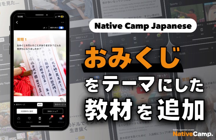株式会社ネイティブキャンプ(本社:東京都渋谷区、代表取締役社長:谷川国洋)が提供するオンライン日本語会話サービス『Native Camp Japanese』では、このたび、人気教材「デイリートピック」に”おみくじ”をテーマにした教材を追加しました。