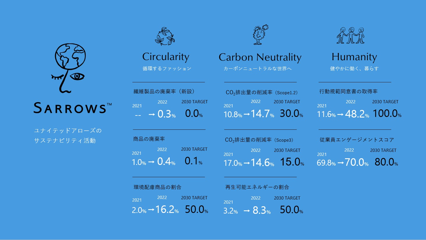 株式会社ユナイテッドアローズ(代表取締役 社長執行役員 CEO: 松崎 善則、本社所在地:東京都渋谷区)は、サステナビリティ活動のスローガン「SARROWS(サローズ)」のもと、2022年8月に、2030年に向けた3つの活動目標:「Circularity(循環するファッション)」、「Carbon Neutrality(カーボンニュートラルな世界へ)」、「Humanity(健やかに働く、暮らす)」を掲げ、各種活動を推進しています。2022年4月~2023年3月(*)までの主な活動と数値目標に対する実績をご報告いたします。