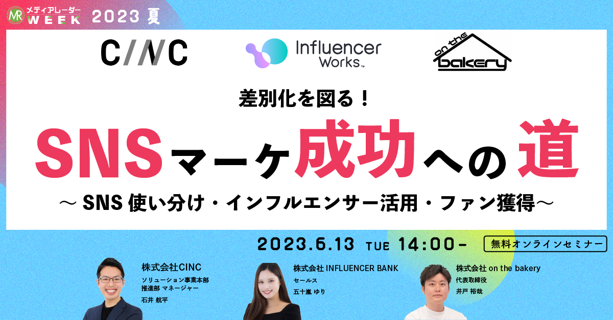株式会社アイズ(所在地:東京都渋谷区、代表取締役社長:福島範幸、東証グロース:5242)が運営するNo.1*の広告業界のプラットフォーム「メディアレーダー」が主催するマーケティングセミナーイベント「第10回メディアレーダーWEEK 2023夏」にて、SNSマーケティングについての専門家たちが6/13(火)に登壇します。視聴申し込みは無料です。