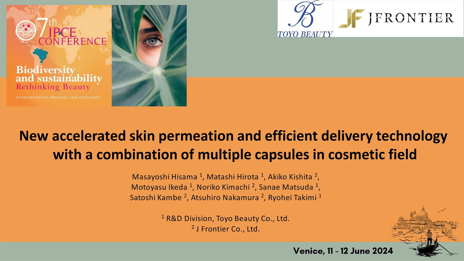 ジェイフロンティア株式会社(本社:東京都渋谷区、代表取締役社長執行役員:中村 篤弘)は、「人と社会を健康に美しく」を経営理念に掲げ、人々の健康増進・生活の質向上に資する自社オリジナル医薬品・健康食品・化粧品の販売といったD2C事業(EC・通販事業)を展開しております。東洋ビューティ株式会社との共同で、複数カプセルの組み合わせによる新たな皮膚浸透促進・効率的なデリバリー技術の研究を行い、第33回「IFSCC(国際化粧品技術者会連盟)学術大会の発表を受けてIPCEでの演題に選出され2024年6月11日~12日に講演致しました。
