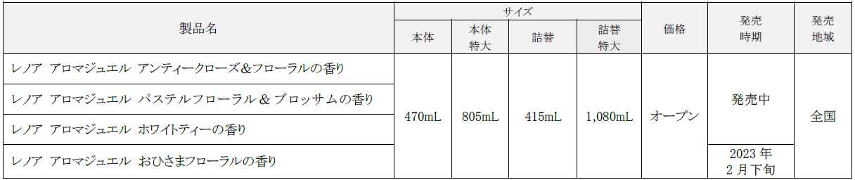 今回新たにラインアップに加わる「おひさまフローラルの香り」は、部屋干しでも、天日干しのようなさわやかなフローラル系の香りを楽しみたいという消費者のニーズに応えて開発した新香調で、“部屋干しでも天日干しのような香り”が12週間続く*2のが特長です。また、従来からご好評いただいている 「パステルフローラル&ブロッサムの香り」も、さらに新鮮な香りにアップグレードしました。