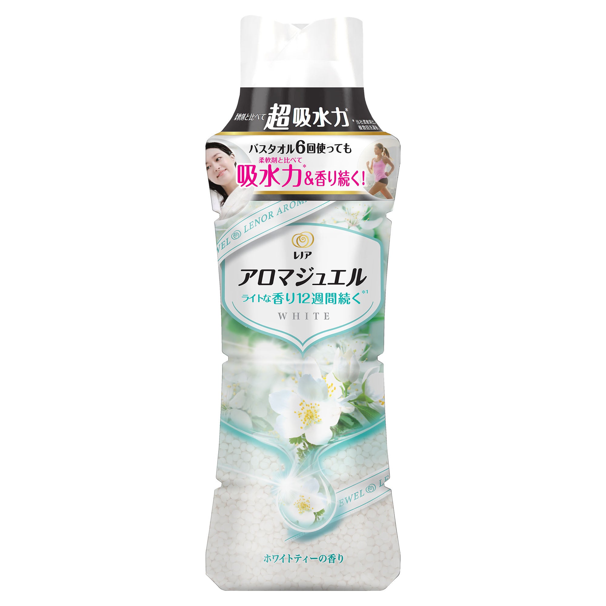 「レノア アロマジュエル」は、お洗濯のはじめにカップで計って洗濯槽の衣類の上に直接入れるだけで、香りを楽しむことができる衣類の香りづけ専用ビーズです。アロマジュエルは、柔軟剤と比べて吸収力*1が高く、吸水性を維持したいタオルなどのアイテムも、アロマジュエルで洗濯をすればサラッと水分を吸収することが可能です。一日で何度か使うハンドタオルは6回使っても、柔軟剤と比べて吸水力*1と香りが長続きします。