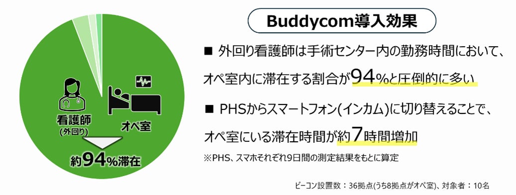 Beacapp Here Hospitalというビーコンシステム※を活用し、手術センターで働く看護師の働き方を可視化しました。PHSとスマートフォンそれぞれの勤務実態を調査することで、インカムが医療現場に与える有用性を定量的に判断することができました。