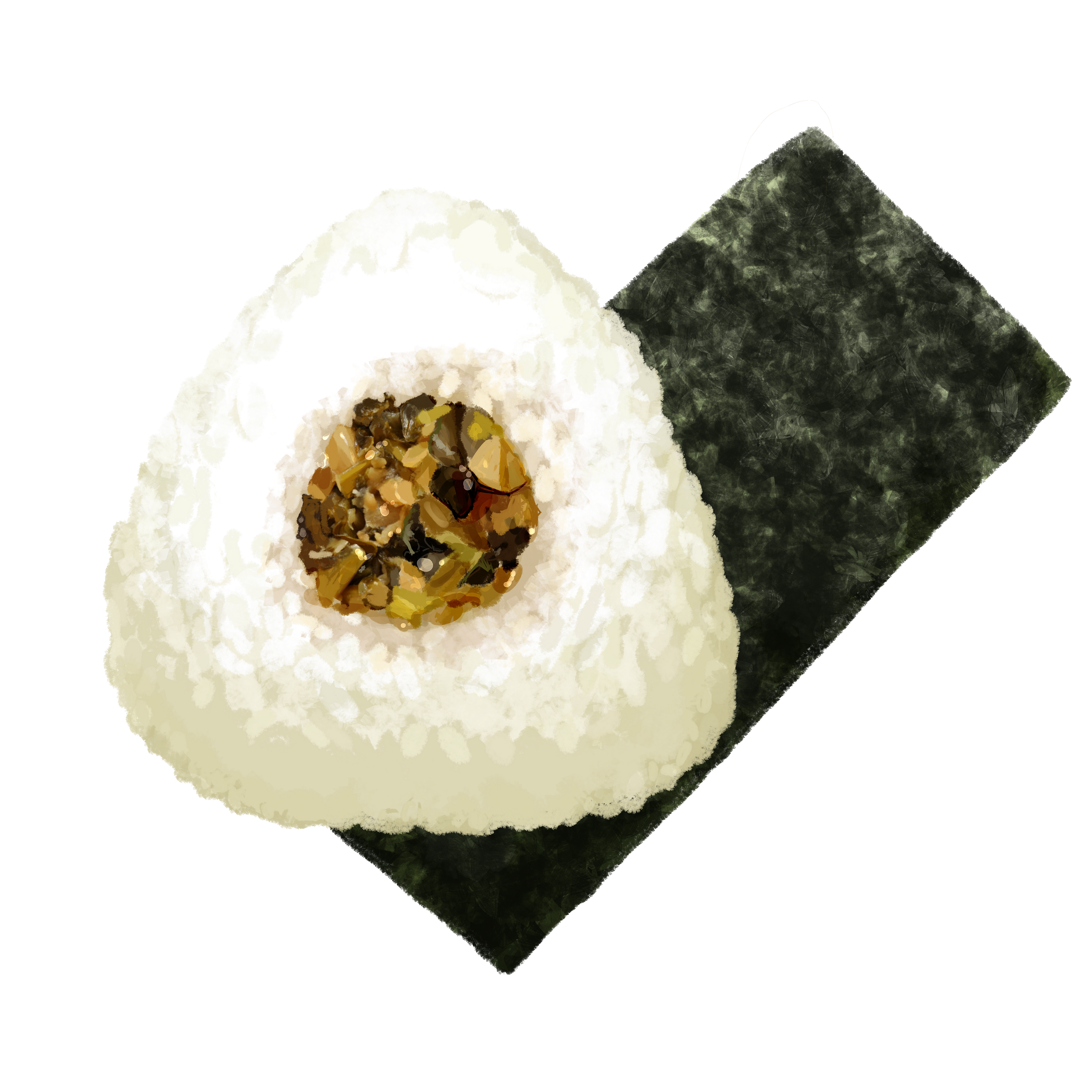 長野の郷土食である「おやき」の野沢菜あんをイメージしておにぎりの具材を作りました。漬物の程よい酸味と甘じょっぱい味付けがお米の甘さを引き立てます。