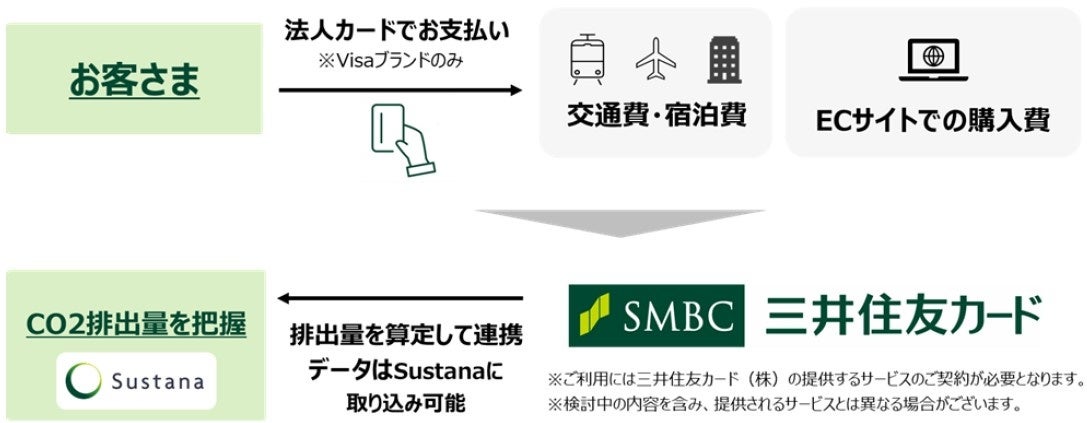 株式会社三井住友銀行(頭取CEO:福留 朗裕、以下「三井住友銀行」)、三井住友カード株式会社(代表取締役社長:大西 幸彦、以下「三井住友カード」)は、ビザ・ワールドワイド・ジャパン株式会社(代表取締役社長:シータン・キトニー、以下「Visa」)の協力のもと、2023年4月より、三井住友カードの法人カードと三井住友銀行の「Sustana」による、CO2排出量算定サービスの提供を開始します。
