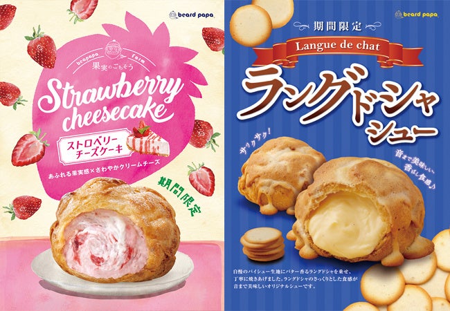 シュークリーム専門店「ビアードパパ」の心躍る春のシュークリーム!苺の果実感あふれる新作シュー“ストロベリーチーズケーキ”と、音まで美味しい“ラングドシャシュー”登場