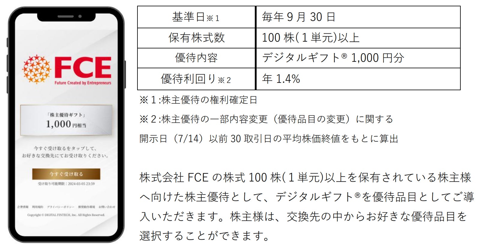 株式会社FCE(代表取締役社長:石川 淳悦、東証スタンダード市場:証券コード9564)において、株式会社デジタルプラス(代表取締役社長:菊池 誠晃、本社:東京都渋谷区、東証グロース市場:証券コード3691)の子会社である、株式会社デジタルフィンテック(代表取締役社長:菊池 誠晃、本社:北海道札幌市)が運営する「デジタルギフト®」を株主優待としてご活用いただくことになりました。
