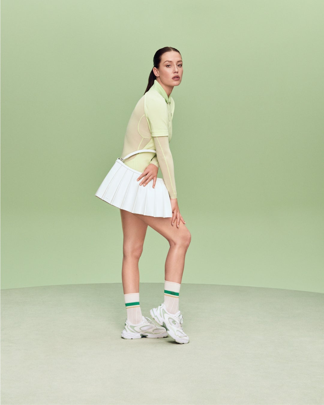 新たにラコステのブランドアンバサダーに加わった女優アデル・エグザルコプロスが、ランランバッグをまるでプリーツスカートのように身に着ける遊び心あふれるトロンプ・ルイユ(だまし絵)演出。クラシックなテニススタイルを、軽やかにファッションとして楽しむアプローチで表現。
