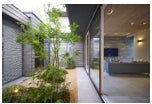 敷地面積に対して狭さを感じさせない住まい。1階は前庭から後庭へと続く通路を設け、通路に面して部屋を配置しました。玄関を通じて前庭から後庭が一望でき、開放感のある空間構成を実現しています。2階は緑を取り込む大きな窓と、自然光を取り込む天窓が設けられ、広場のような生活空間を創出しました。家具は住人にとって最適な生活環境とするため、分散して配置しています。