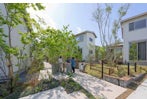 シンボルツリーとウッドデッキを中心とした3棟からなる分譲住宅。建物やカースペースの配置、植栽計画等の工夫により、コミュニティゾーンとプライベートゾーンを明確に区分しました。大きな木の下にあるウッドデッキは、3棟をつなげて住人同士の交流を生み、プライベートな庭では適度な距離感を保ちながら落ち着いた時間を過ごすことができます。その時の気分で使い分けられる2つの庭があることで、気ままに暮らし、ご近所同士の関係を育むことができるようデザインしました。