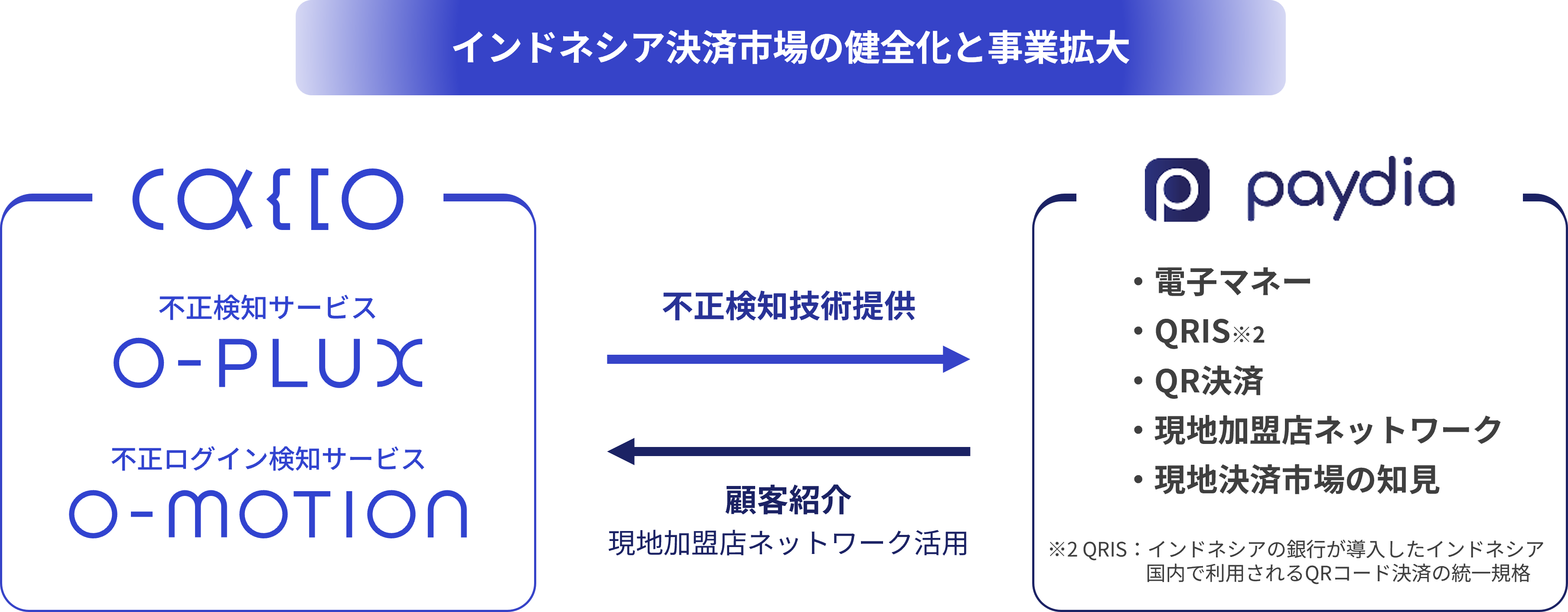 国内導入実績No.1※1の不正検知サービスを提供し、安全なネット通販のインフラづくりに貢献するかっこ株式会社(本社:東京都港区、代表取締役社長 : 岩井 裕之、証券コード:4166、以下 Cacco)は、ジャカルタを拠点とするフィンテック企業で、デジタル決済ソリューションを展開するPT Datacell Infomedia (Paydia), Headquarters: Jakarta, Indonesiaと業務提携いたしました。本提携により、Paydiaが提供するデジタル決済サービスにCaccoの「O-PLUX」、「O-MOTION」が導入されることで、インドネシア決済市場における不正検知サービス展開の拡大を推進します。